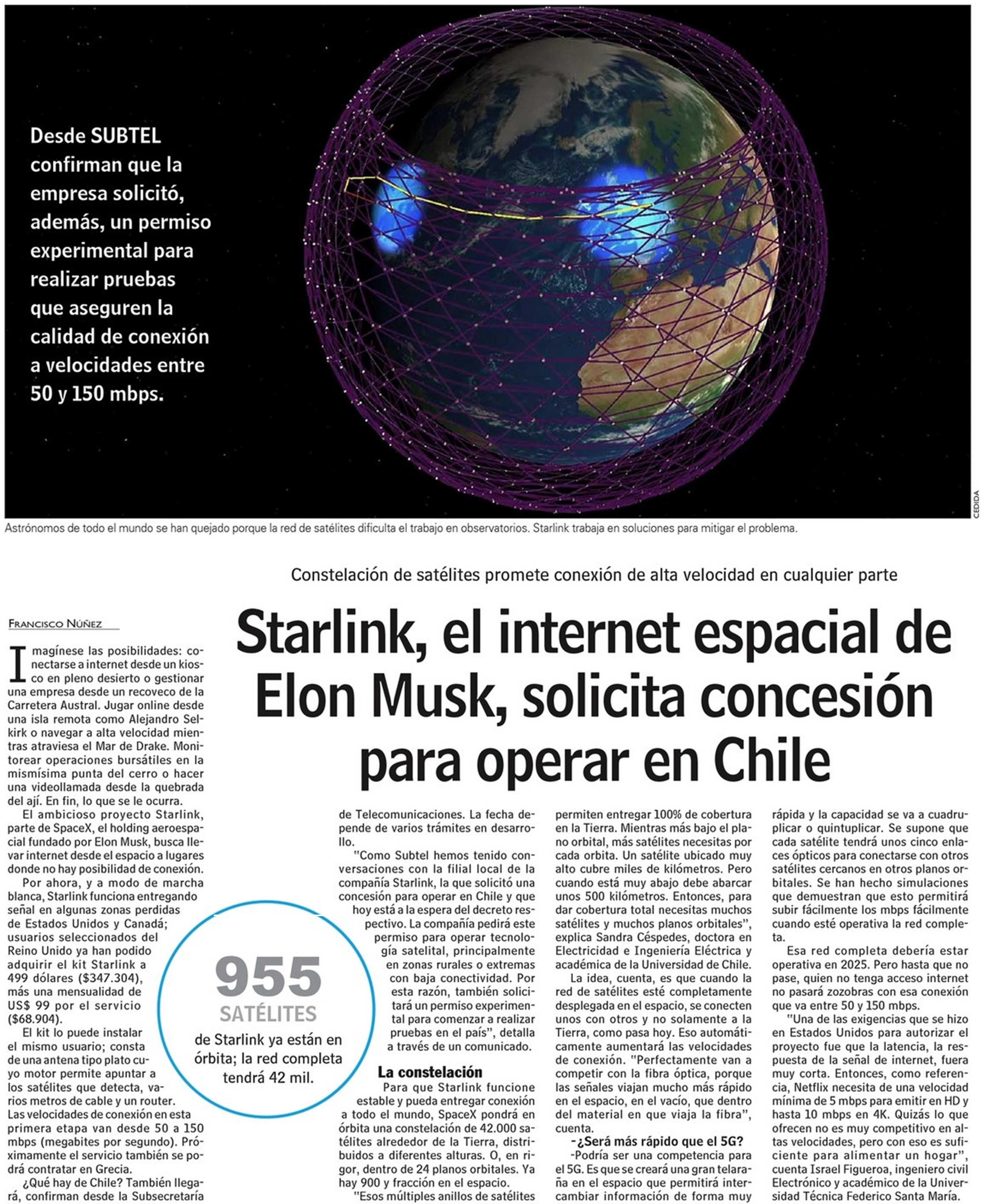 Starlink Chile : Spacex Solicita A Subtel Instalar Estaciones Satelitales En Chile Para Su Servicio De Internet Satelital Starlink Dplnews - Starlink es una empresa que nació como proyecto de spacex para la creación de una constelación de satélites de internet con el objetivo de brindar un servicio de internet de banda ancha, baja latencia y cobertura mundial a bajo coste.